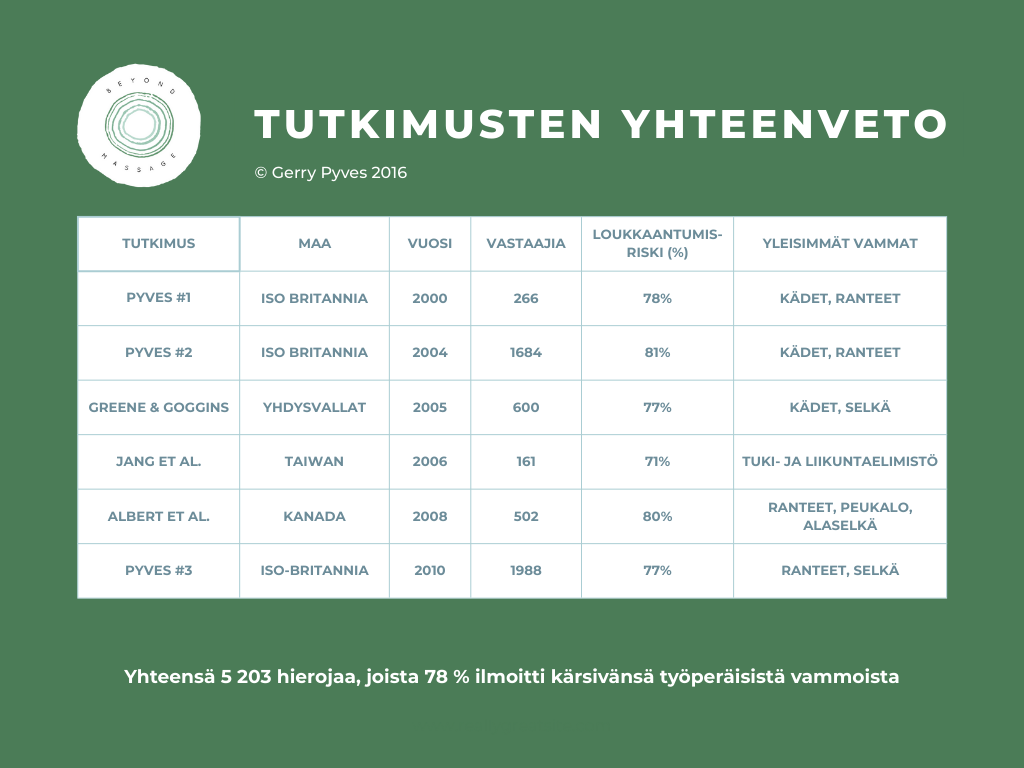 Kaiken kaikkiaan nämä kuusi tutkimusta kartoittivat yhteensä 5 203 hierojaa, joista huikeat 4 081 eli 78 % ilmoitti kärsivänsä vammoista. Kaikki tutkimukset ovat yksimielisiä siitä, että vammojen esiintyvyys on hälyttävän korkea, ja ne kohdistuvat pääasiassa hierojien käsiin ja selkään.